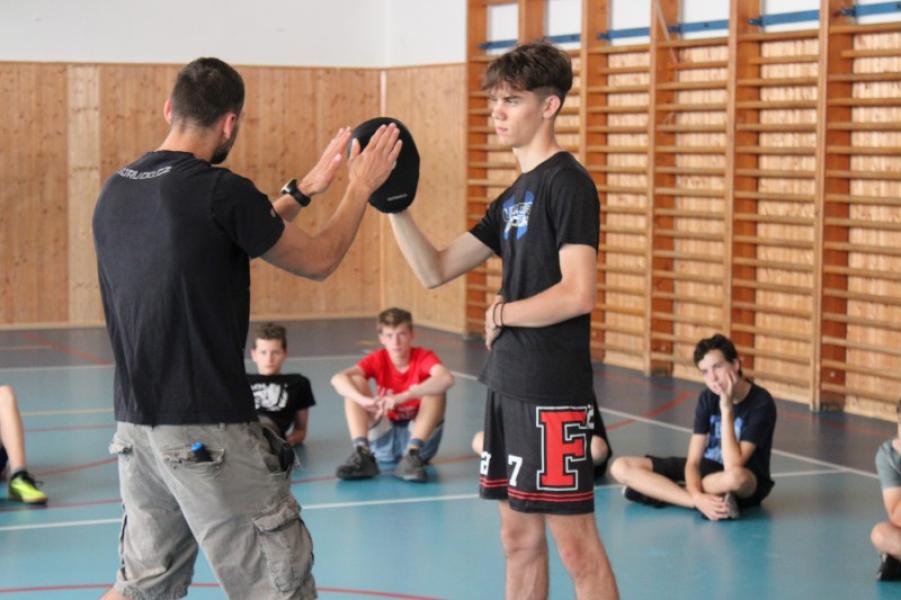 Žáci devátých ročníků doplnění o zájemce z osmých tříd tak v červnu absolvovali dvanáctihodinový kurz sebeobrany rozdělený do tří dnů. Zažili modelové situace, učili se, jak nebezpečným situacím předcházet, osvojovali si též základní techniky sebeobrany a dozvěděli se základní informace z legislativy související se sebeobranou.