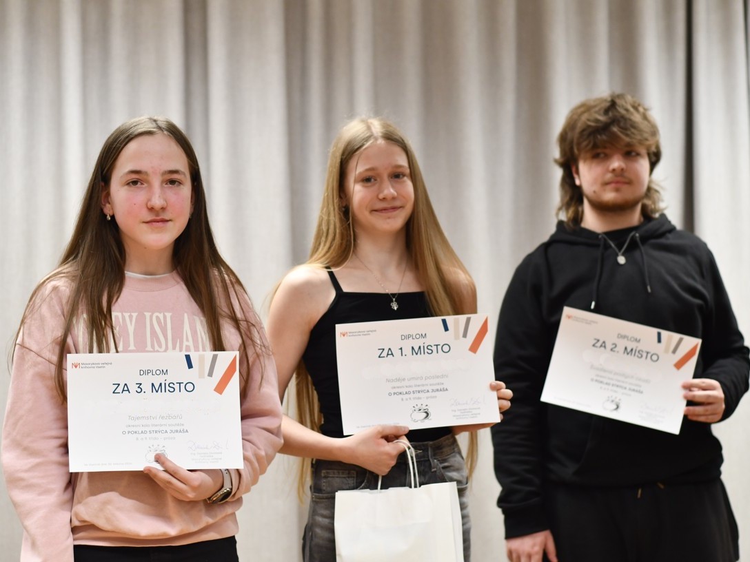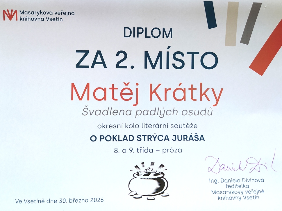 Próza s názvem Švadlena padlých osudů slavila úspěch i v okresním kole literární soutěže O poklad strýca Juráša. Její autor Matěj Krátky z 9. A tak 30. března převzal v Masarykově veřejné knihovně Vsetín další zasloužené ocenění. Příběh o mladé francouzské návrhářce za druhé světové války získal ve své kategorii 2. místo a bude zveřejněn v elektronickém sborníku prací na stránkách knihovny.